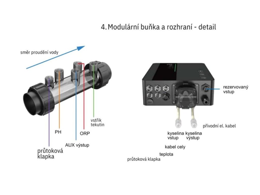 Součástí systému je pH sonda, která nepřetržitě sleduje hodnotu pH vody v bazénu. Pokud hodnota překročí optimální rozmezí, zařízení automaticky dávkuje regulátor pH z kanystru a vrací vodu zpět do ideální rovnováhy.
